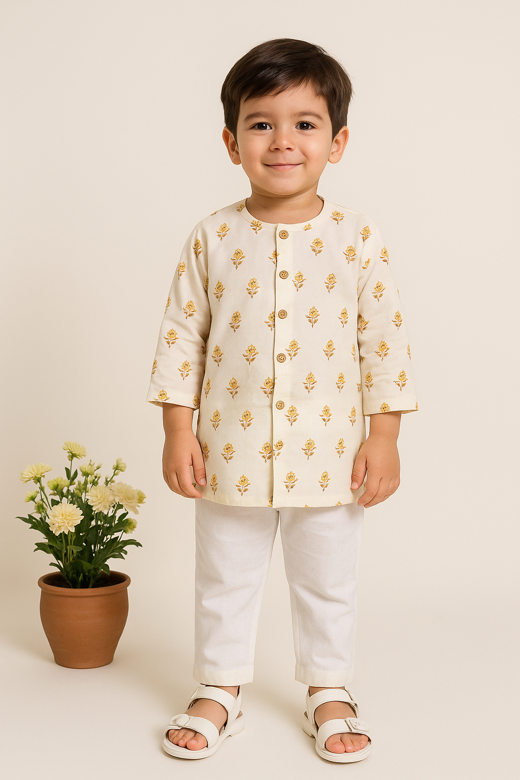 Boy Tiny Blooms Printed Kurta Pant Set- Mustard