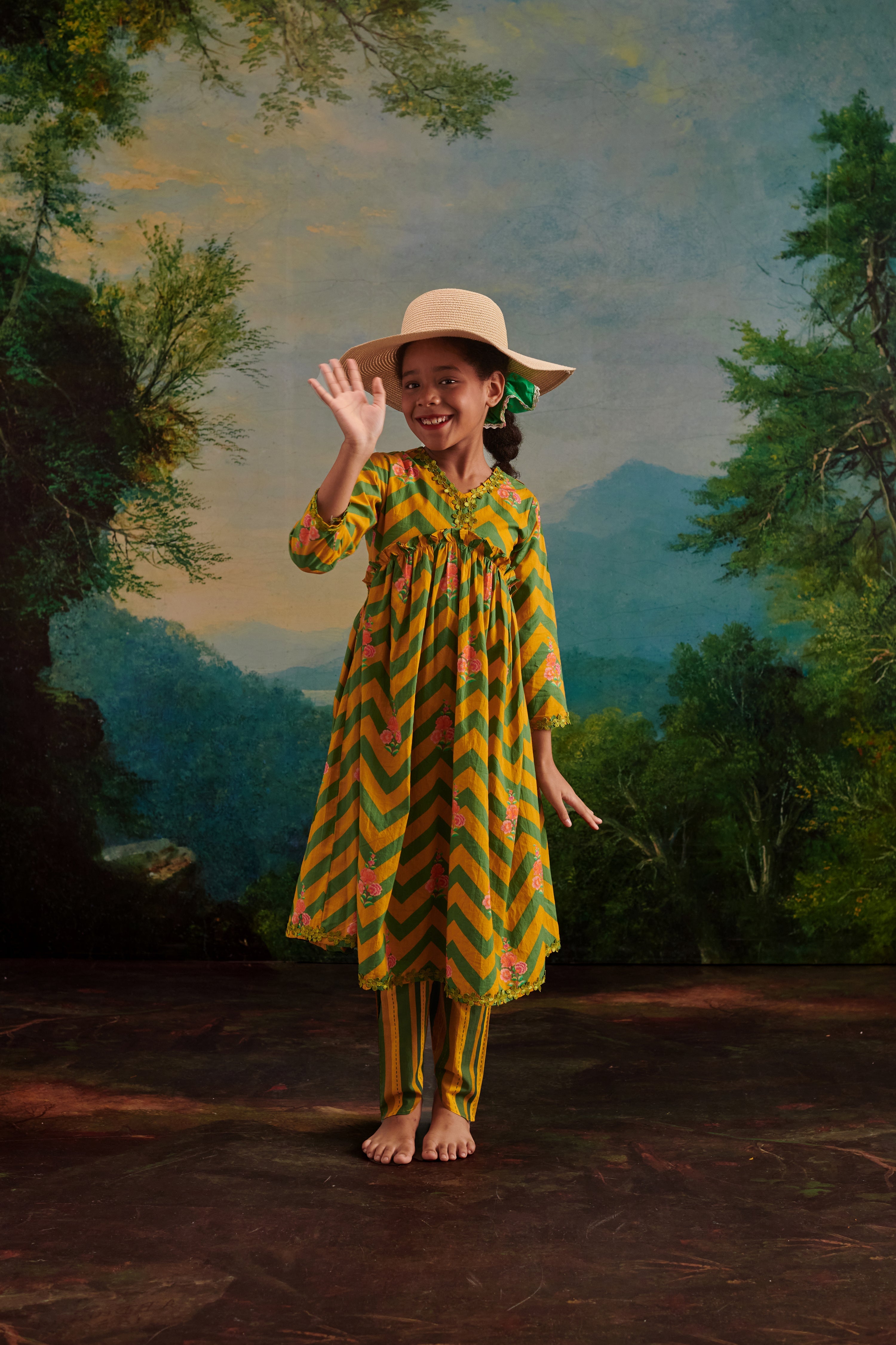 We at Cute Couture always keep in mind that comfort should not be compromised for any cost so keeping in mind this set has been designed . The unique floral lace embroidered set is best for divas . The a line top with floral check and stripes highlights on yolk and flare and laces goes well with the all season around and it can be worn anytime and anywhere. The stripes pants  add more charm and beauty .
