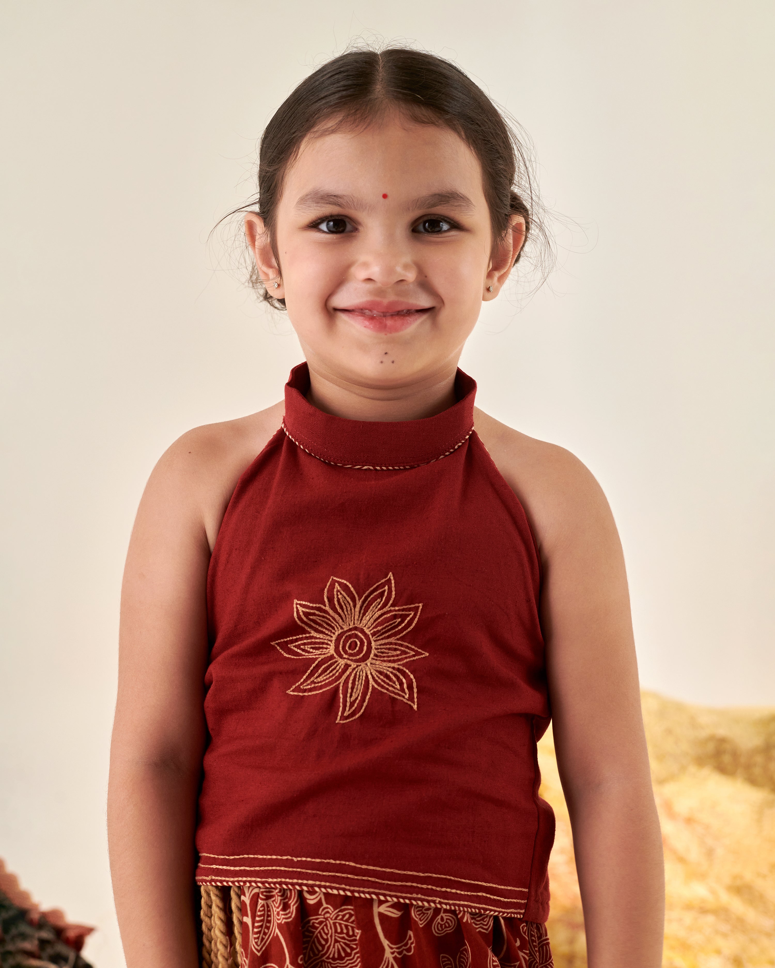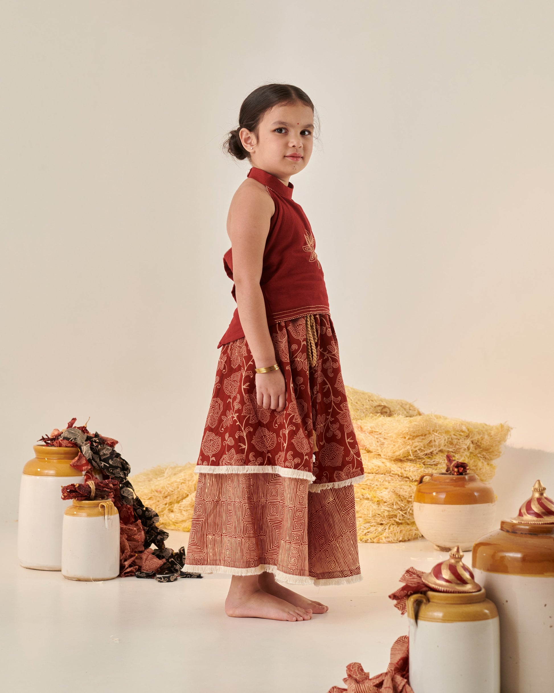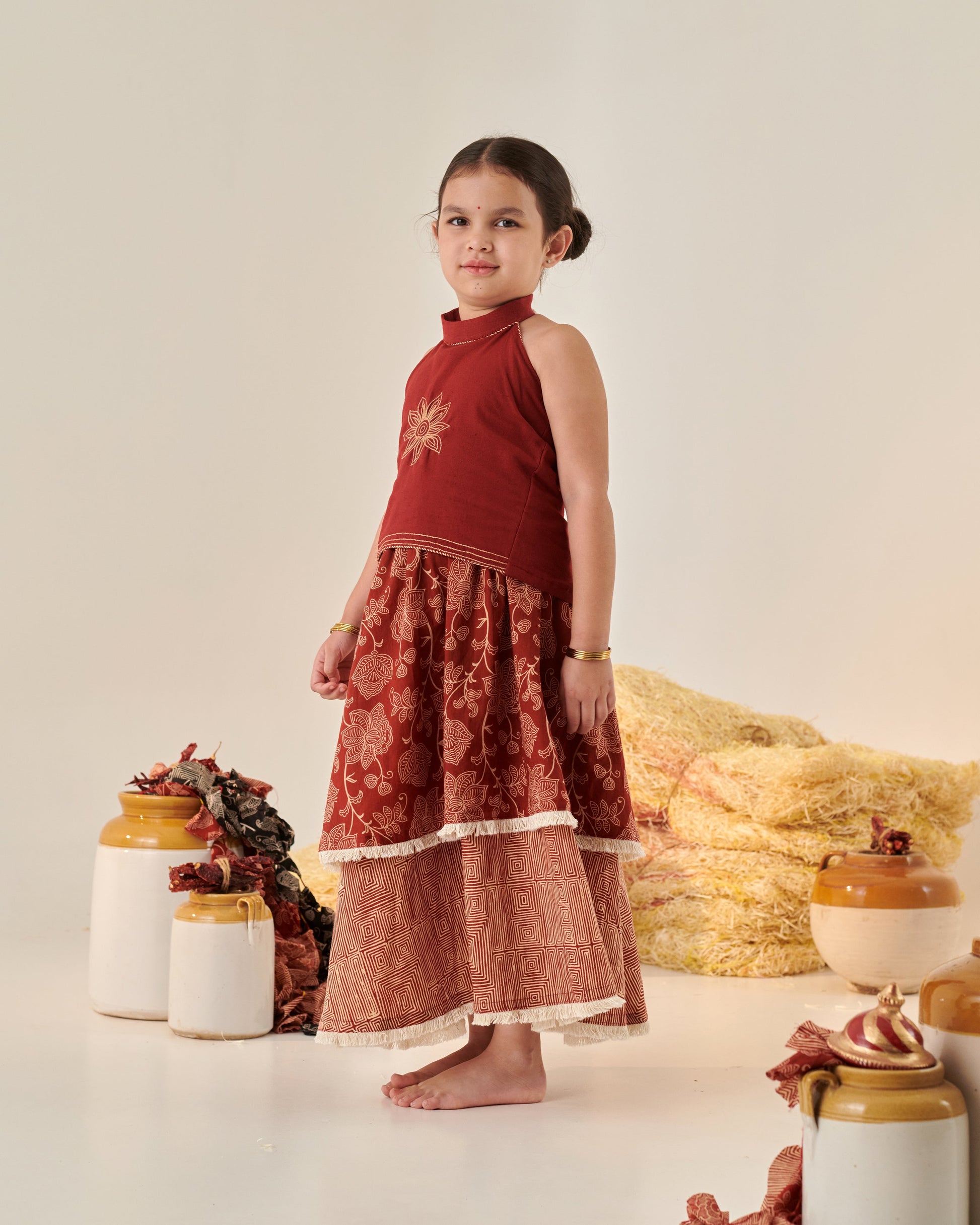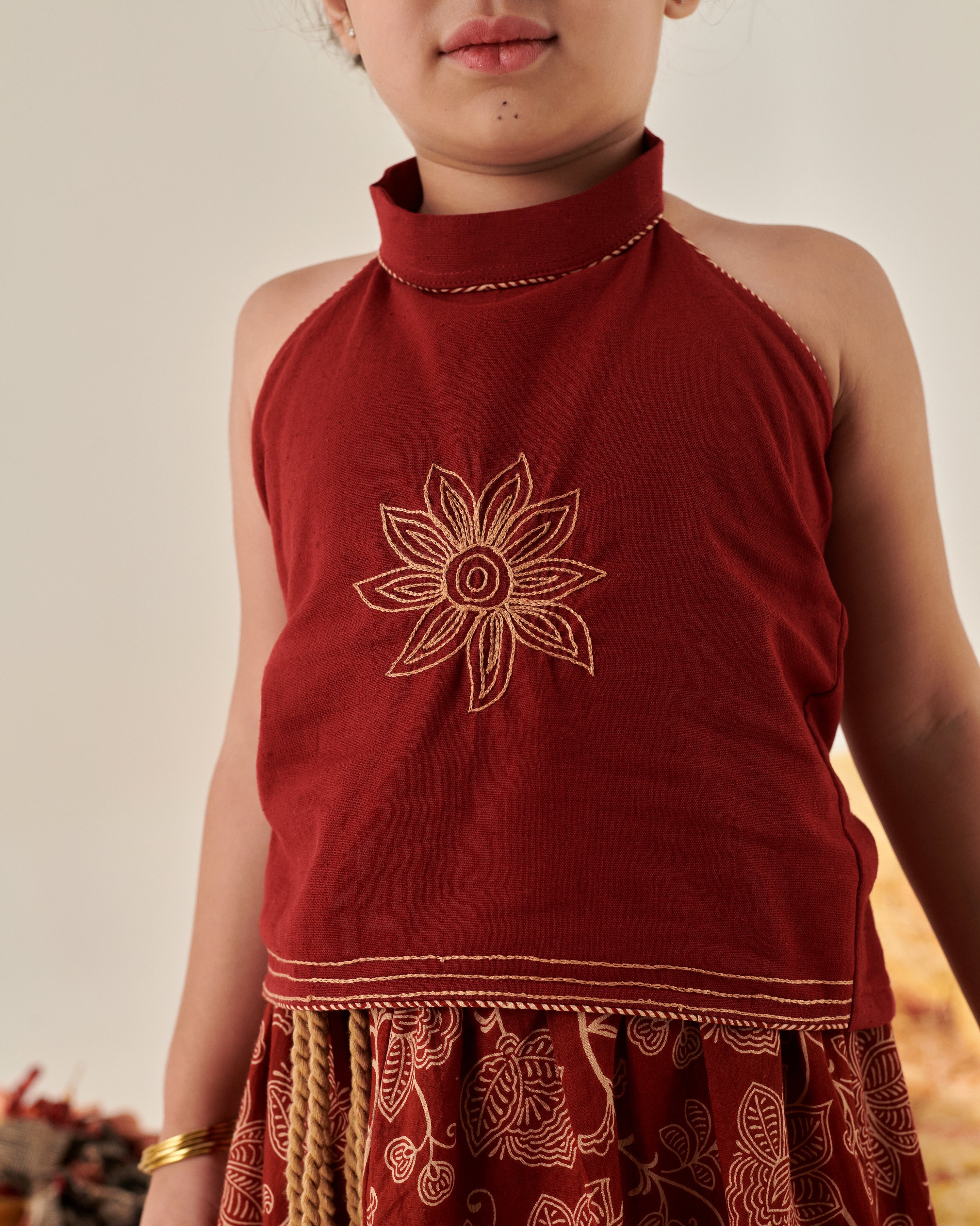 Girl Floral Embroidered Skirt Top Set-Green - Maroon