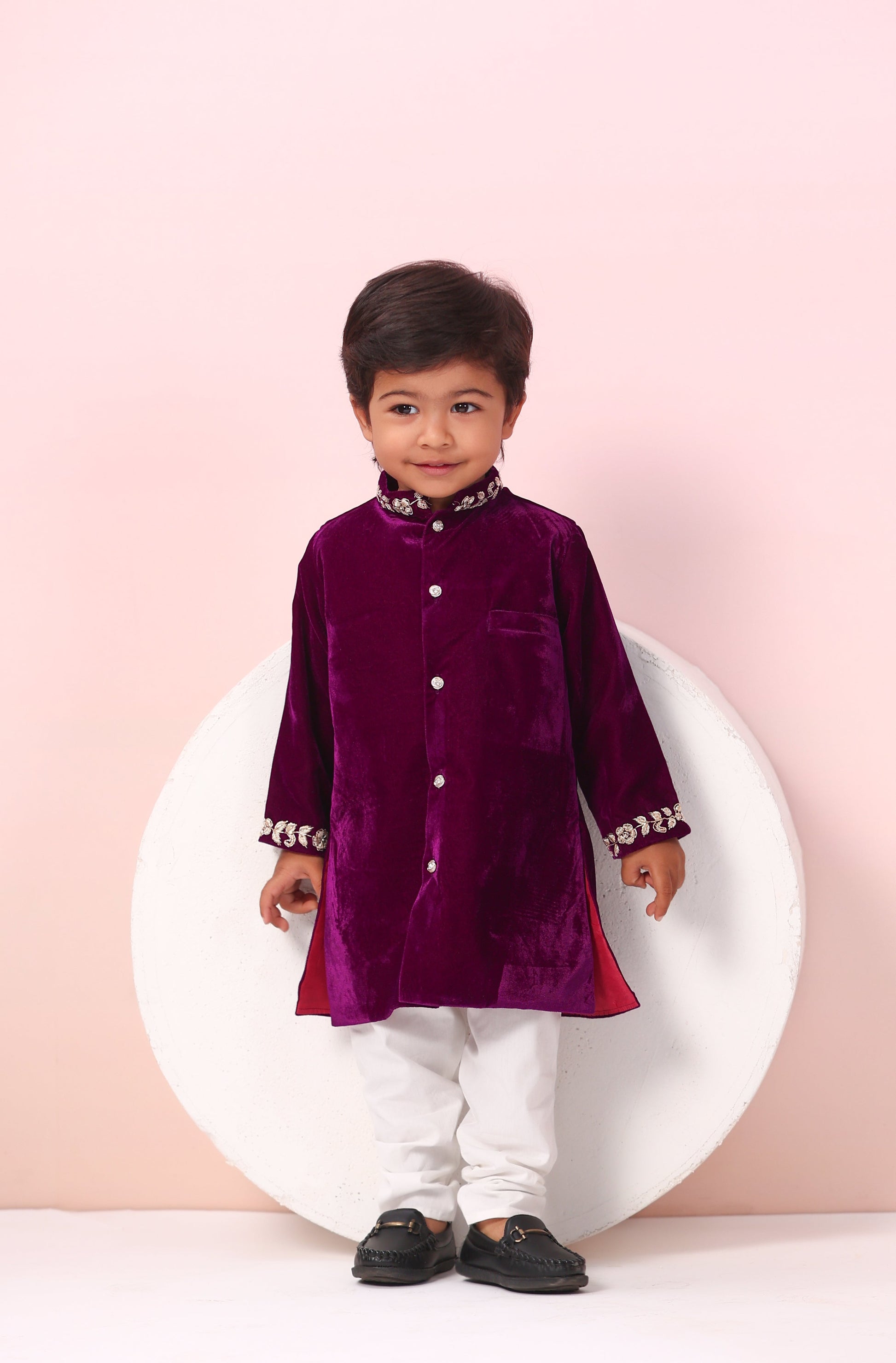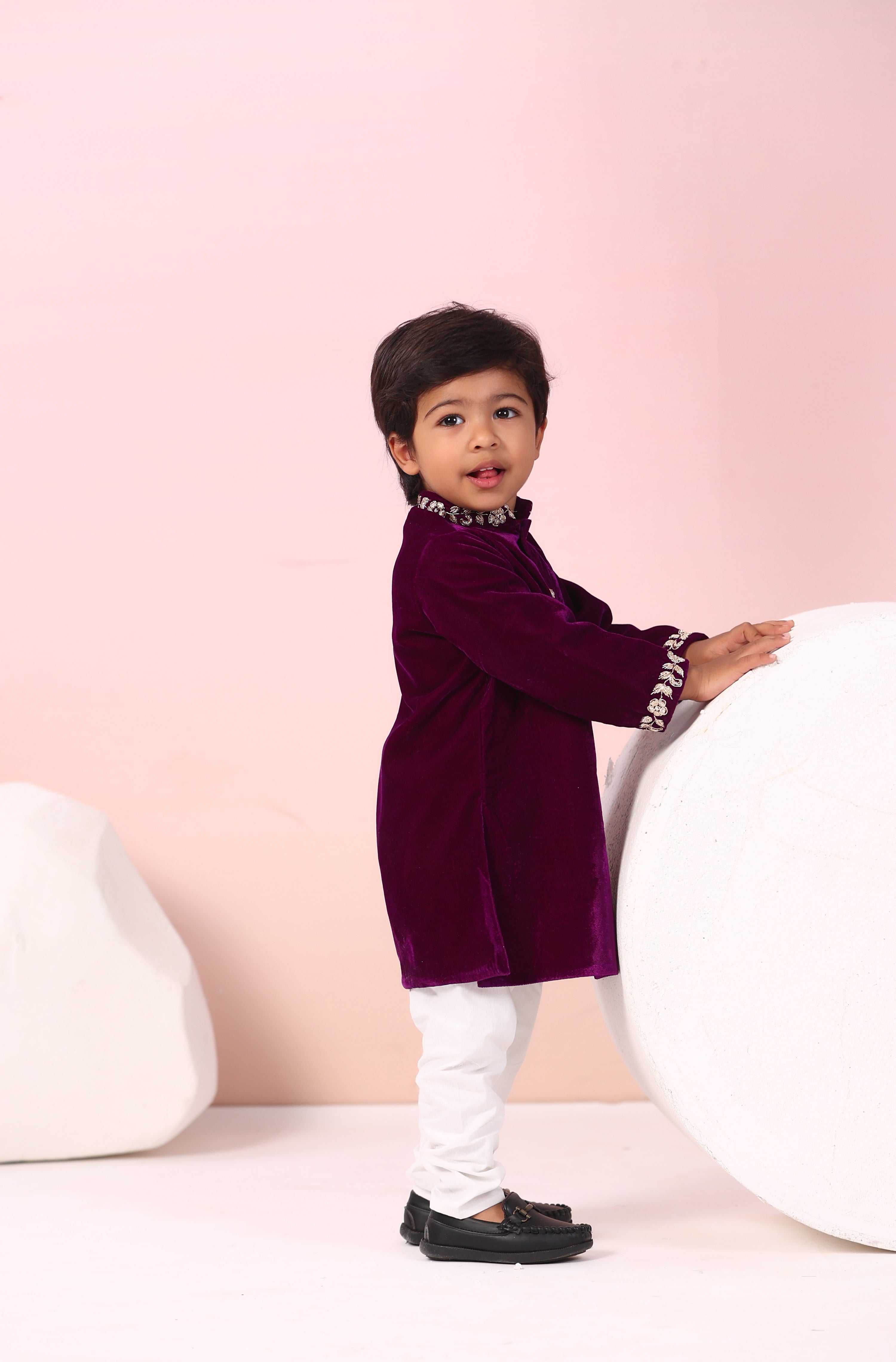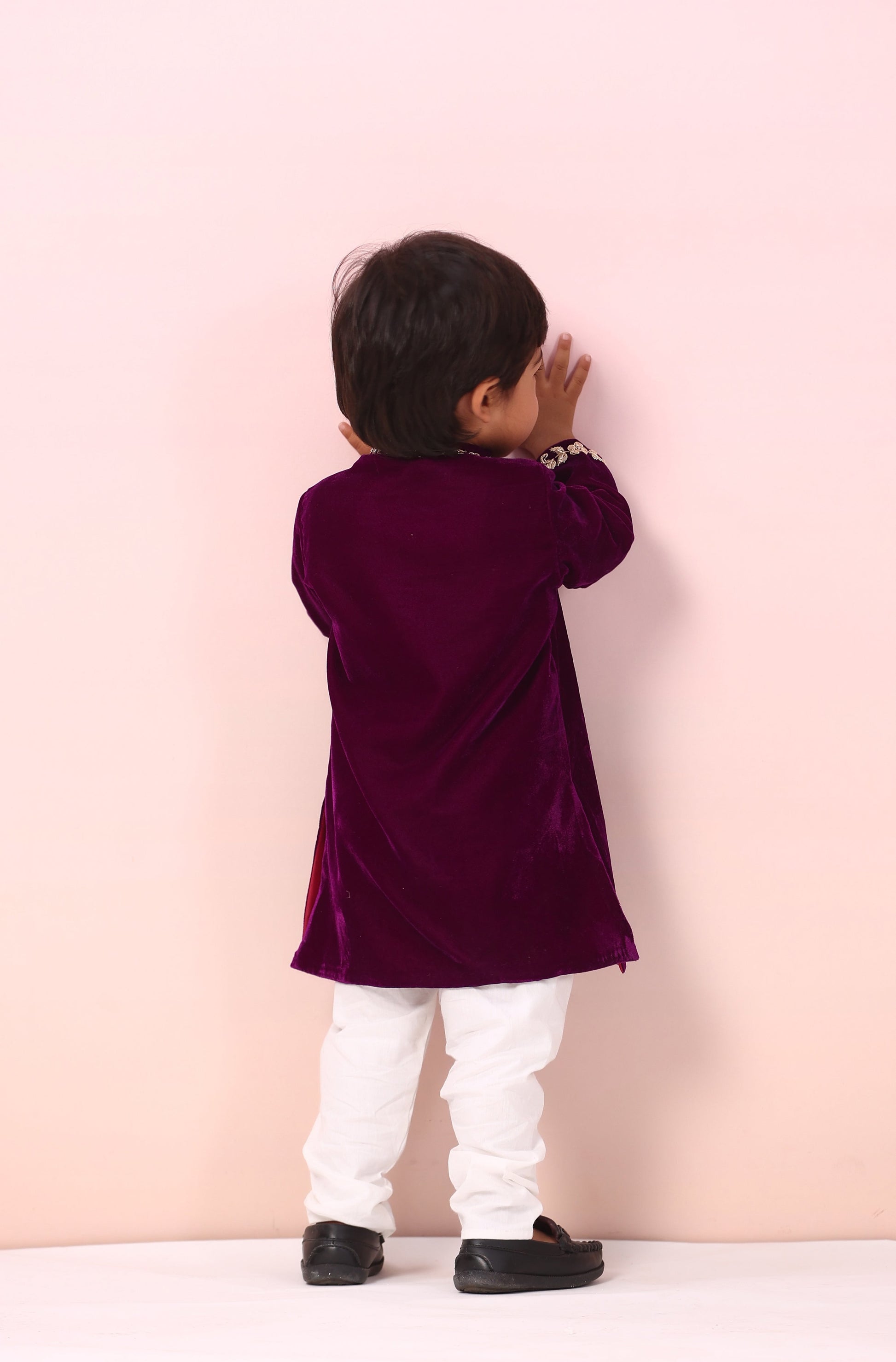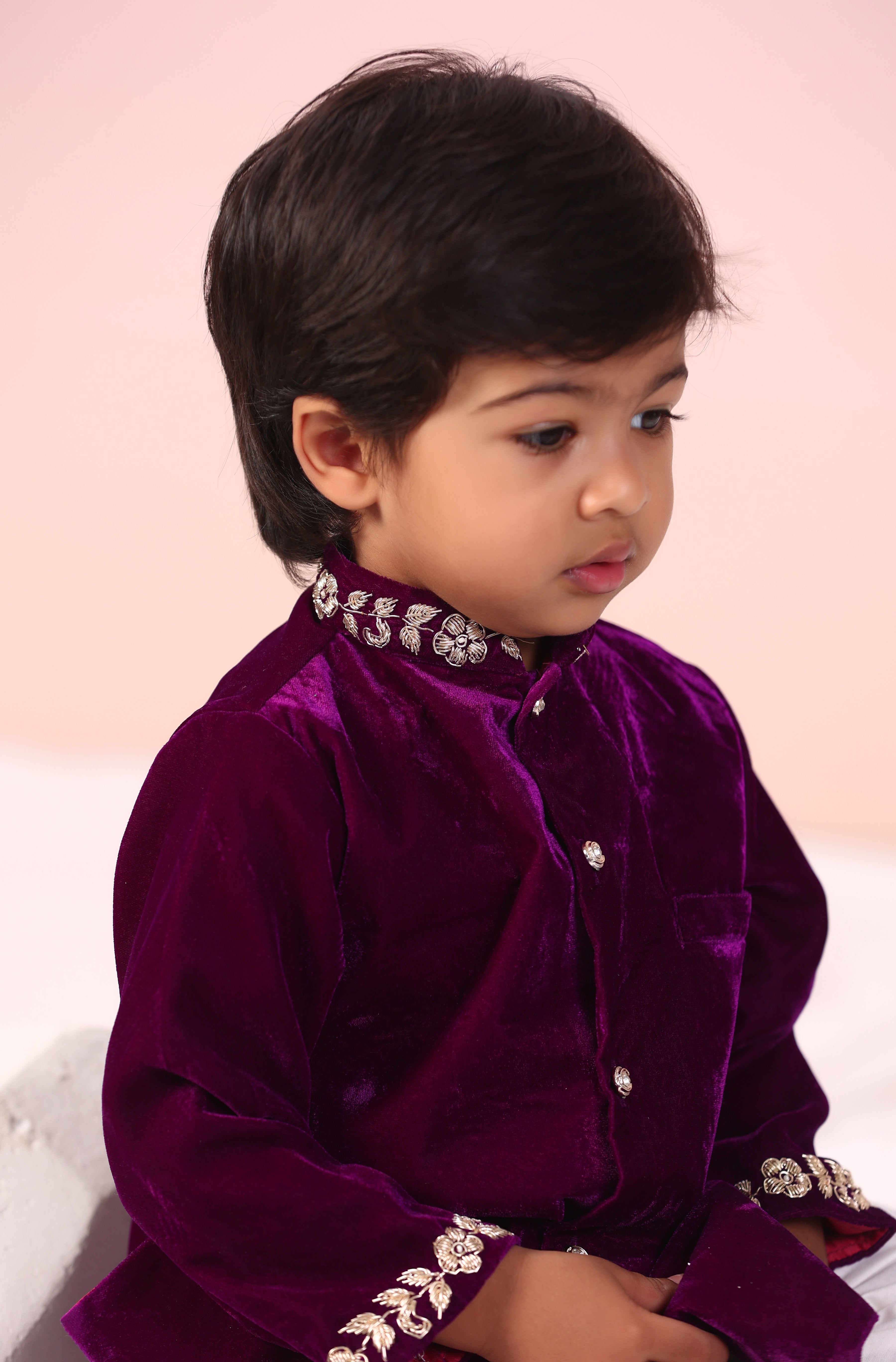 Make your boy look even the best by dressing up in our classic kurta set in all time favourite classic velvet kurta. This kurta adds glamour and shine to the entire by unique dazzling colour and flared balloon pants