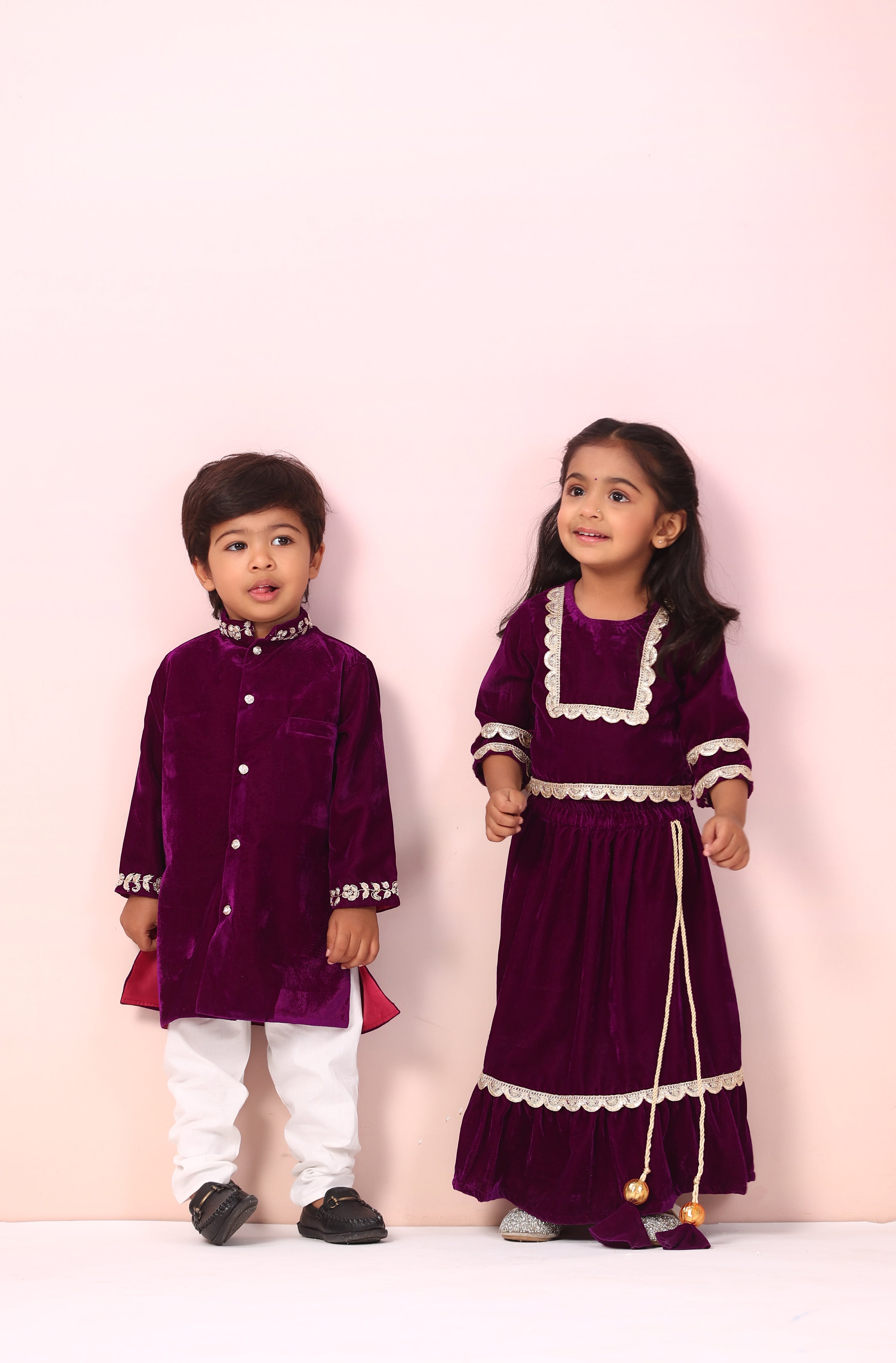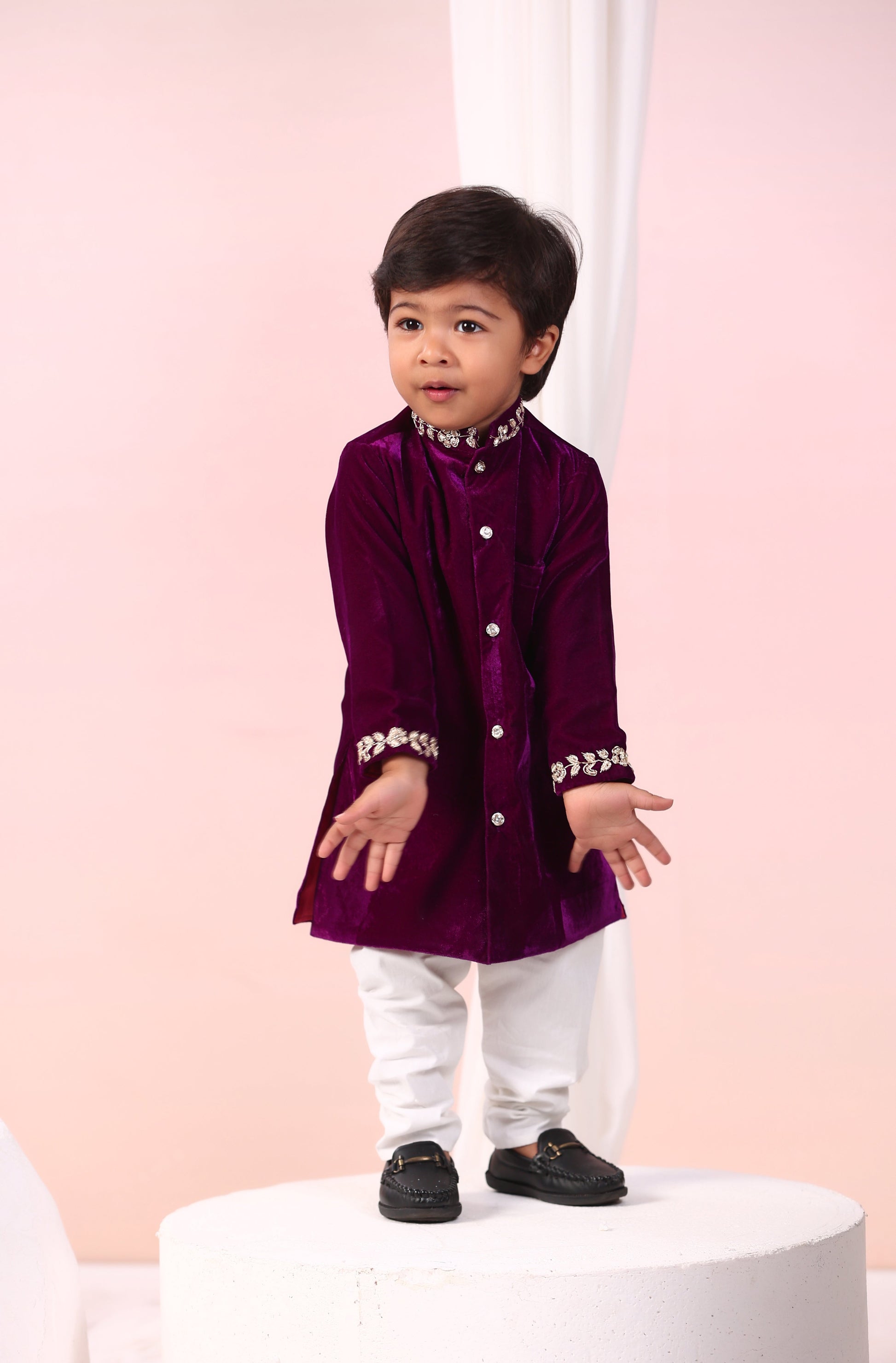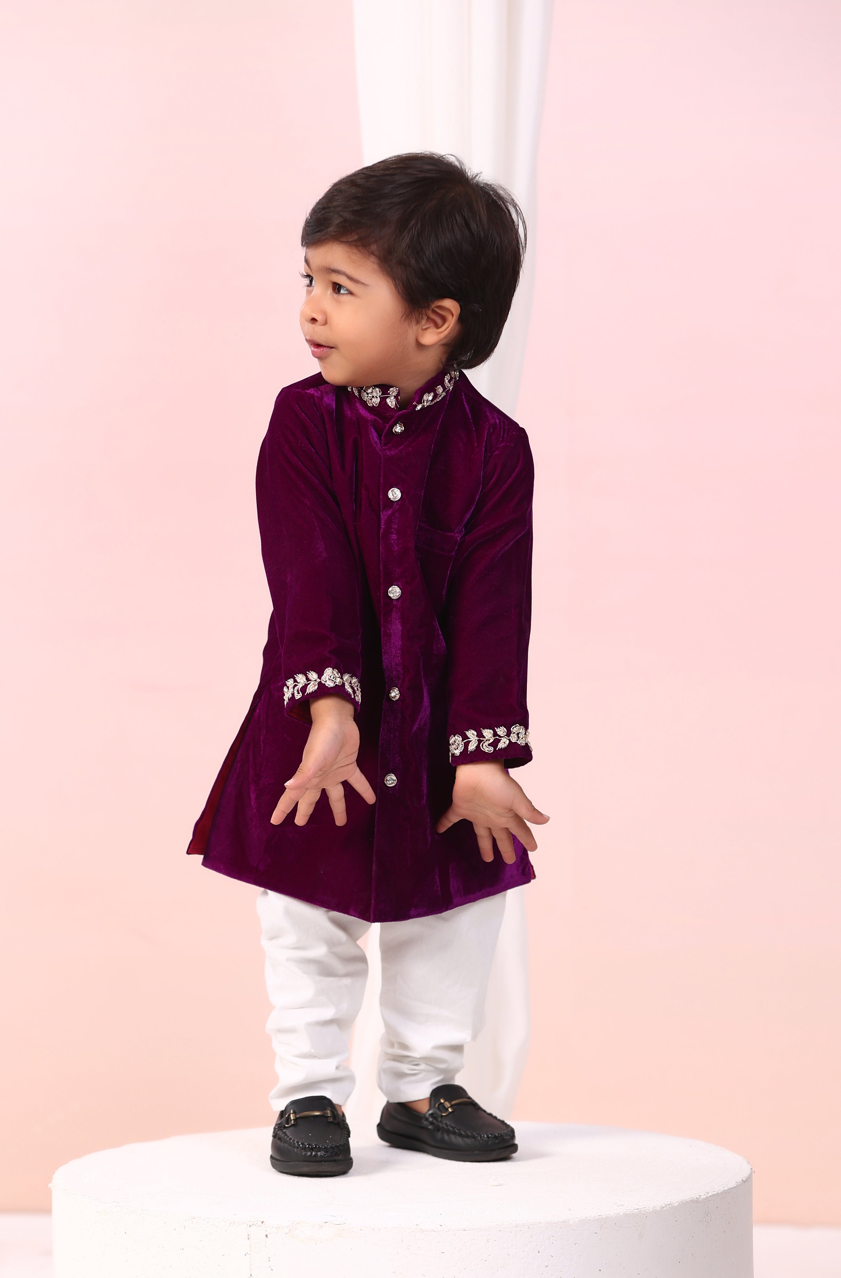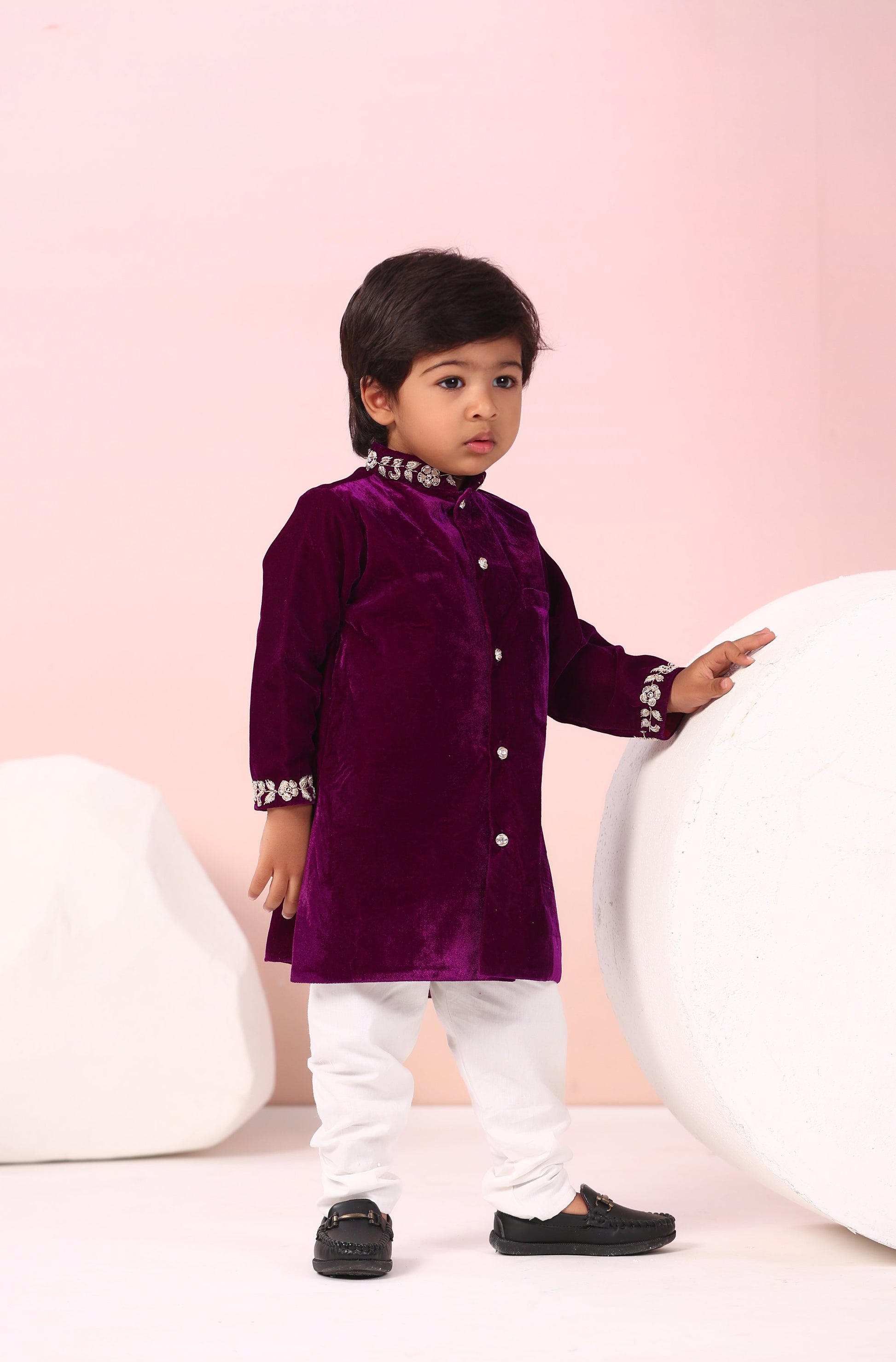 Make your boy look even the best by dressing up in our classic kurta set in all time favourite classic velvet kurta. This kurta adds glamour and shine to the entire by unique dazzling colour and flared balloon pants